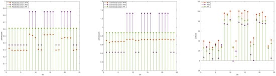 Considering the smart grid system in a small area, we present numerical simulation results within a 24 h time pattern as an evaluation of daily operations. The electricity demand of residential users was randomly selected from , with . The electricity demand of commercial users was randomly selected from , with . In the utility function, and , using and in the cost function, and the initial price and . Meanwhile, the initial power supply and ; we adopted , , , , , and .