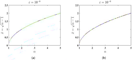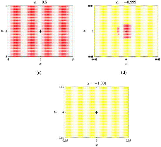 We numerically compute the value for a large number of values of for and The results are presented in Figure 1. The equilibrium points where are plotted in blue; the equilibrium points where are plotted in green. In red, we label the points where change signs. It is remarkable that a small domain of attraction where the equilibrium points remain stable can always exist. As the value of increases, this domain shrinks, but it still exists around the equilibrium points. Therefore, the equilibrium points and are stable for .