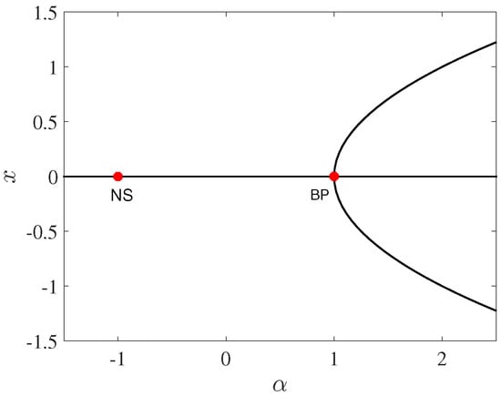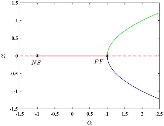 While varying the parameter of Equation (6), we generically encounter one codim-1 bifurcation related to stability changes of the equilibrium point , namely Niemark–Sacker (NS) bifurcation, where the characteristic Equation (8) has a simple pair of complex roots with . This bifurcation occurs at when . A nongeneric situation occurs at a pitch-fork bifurcation (PF) when (note that the equilibrium point splits into two symmetric branches of equilibrium points and as the value of crosses the critical parameter value —see also Figure 2). We will use the normal form theory for discrete-time dynamical systems (see [22,23]) to study the NS bifurcation of Equation (6).
