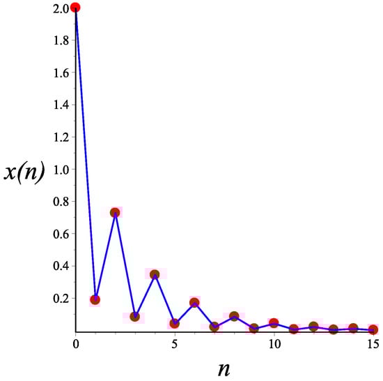 Let and be the initial conditions of Equation (6) where . Then, Theorem 4 implies that the solution converges to zero. Table 3 sets forth the values of for selected small values of n. See also Figure 4.