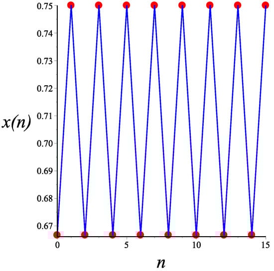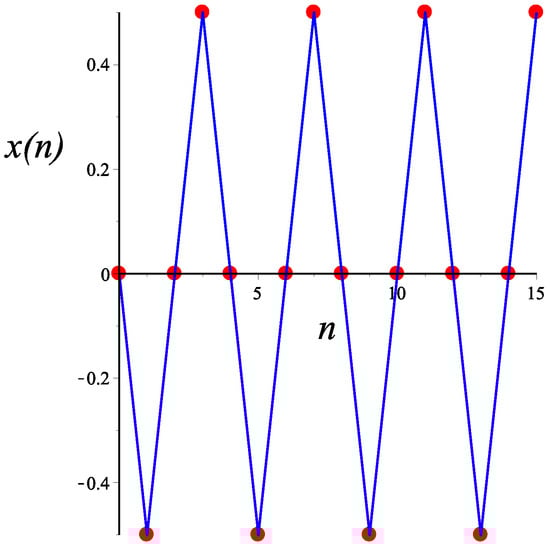 The nontrivial solutions of Equation (6) will be periodic with period 2 if the initial conditions are chosen such that . and . Then, .