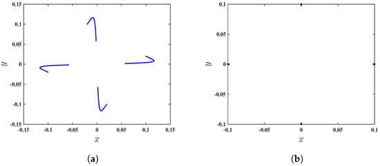 Phase portraits of System (13): (a) and initial value ; (b) a periodic solution of period 4 for and initial value .