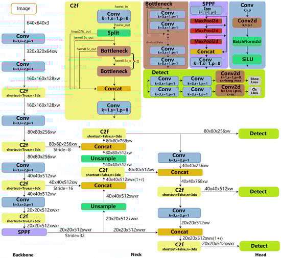 One should note that Yolov8 considers three loss functions: bounded box, class, and distribution focal losses. Distributed focal is designed to raise object detection accuracy. Unlike standard loss functions, this type of loss focuses on hard-to-detect examples, assigning more weight to challenging instances and making it easier to learn from them. The bounded box loss analyzes the correctness of the model’s predicted boxes aligned with the objects in images. The class loss measures each predicted bounding box classification correctness. The network architecture of YOLOv8 is illustrated in Figure 1.