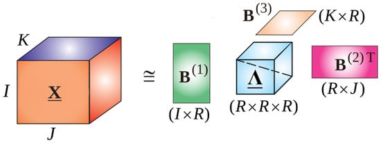 where are non-zero entries of the diagonal core tensor and , and ∘ is the outer product. To clarify the concept, the CP decomposition of the three-order tensor is given in Figure 2.