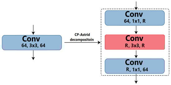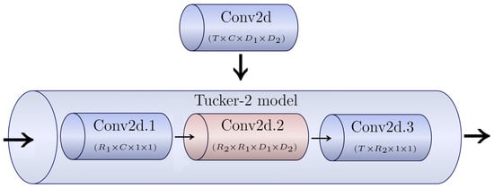 The Yolov8 architecture consists of many convolutional layers in the backbone, neck, and head blocks, as shown in Figure 1. These three blocks contain the Conv, SPPF, Bootleneck, C2f, and detect modules. The kernel in each Yolov8 convolution layer is represented by the fourth-order tensor , where T and C are the number of output and input channels, and and are the size of the filter. In many deep convolutional neural networks, kernels process much redundant information. Therefore, we approximate the kernel tensors by lower-rank structures obtained from various tensor decompositions. To accelerate the training process, we decompose these layers into blocks of sub-layers of a smaller shape. The decomposition of the Conv2d layer is made using the CP-Astrid [24] and Tucker-2 schemes [25], shown in Figure 4 and Figure 5.