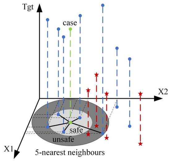 Figure 2 shows a composite example of a seed sample and its 5 closest neighbors. “Tgt” represents the samples showing high relation; the high relation category is represented by the blue dotted line with dots at both ends; the low relation category is represented by the red dotted line with asterisks at both ends; the “case” represents the parameters and dimension results corresponding to a certain processing operation, set as the seed sample; and the horizontal and vertical coordinates represent two different processing parameters. The dark gray “Safe” indicates the area where the data points whose processing dimensions are within the safety margin are distributed, while the light gray “unsafe” indicates the area where the data points whose processing dimensions are within the unsafe margin are located. Different interpolation methods are adopted in the two zones. “Five-nearest neighbors” represent the 5 other data points closest to the seed sample in the data control. The effect is that if the dataset has far more qualified data points than unqualified data points, a few classes of samples can be processed based on the division of the “safe” and “unsafe” zones and the nearest neighbor information. A few class samples are selected in the “unsafe” area, and then new minority class samples are generated by using the information of its nearest neighbors through the over-sampling technology in the SMOGN algorithm to balance the dataset and improve the model’s ability to identify abnormal processing dimensions.