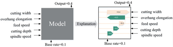 Figure 4, first of all, input some known conditions to the model (cutting width, overhang elongation, feed speed, cutting depth, spindle speed), then train the model based on the inputs, Finally, the trained model can output prediction results for this condition (output = 0.4). However, it is impossible to know how the calculation inside the model is performed, and the SHAP model can let us know how these known conditions affect the final prediction results.