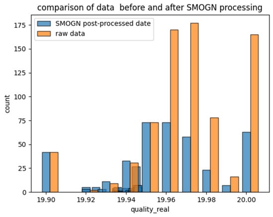 The blue bars represent the pre-processed data and the orange bars represent the SMOGN post-processed data. The blue bars indicate that the number of samples in the original data is higher for the quality_real values of 19.96, and 19.97, which is around 175, while the number of samples for other quality_real values is relatively low. The orange bars show the distribution of the data after SMOGN processing, and it should be noted that the processed data are weakened on distributions with more quality_real samples, e.g., lowering the number of samples around 19.96, 19.97, 19.98, and 20.00, and re-synthesizing to a certain number of samples on distributions with fewer samples, e.g., raising the number of samples around 19.92, 19.93, and 19.94 near to which the sample size was raised.