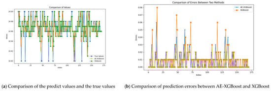 Figure 7a, the horizontal axis index, ranging from 0 to 80, represents the index of the data points, and the vertical axis values ranging from 19.90 to 20.00 represent the size of the data points; the blue folds in the figure represent the true values, with values ranging from 19.90 to 20.00, and the orange discounts in the figure represent the predicted values from the AE-XGBoost model, with a value range between 19.90 and 19.98; the green discount in the figure represents the value predicted only by the XGBoost model, and the value range is between 19.90 and 20.00. It can be seen in the figure that the predicted value of the AE-XGBoost model is closer to the real value, the value is relatively stable, and it may be closer to the real value around 40, 50, 60, and 70.
