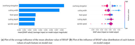 Figure 8b represents the SHAP values ranging from −0.02 to 0.02, and the vertical axis lists five different features: overhang elongation, cutting width, feed speed, cutting depth, spindle speed. The color of the scatter points change from blue to red, with blue representing a lower value of the feature and red representing a higher value of the feature, which shows the effect of different features at different values on the model output.