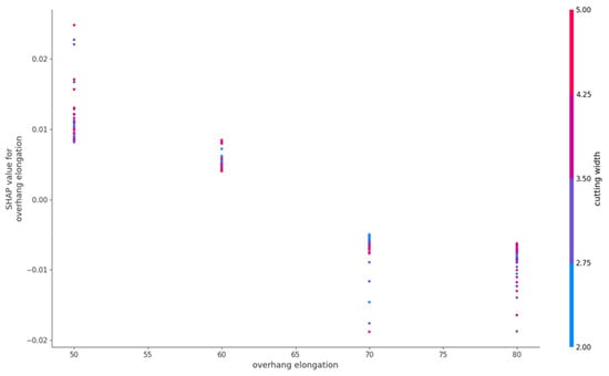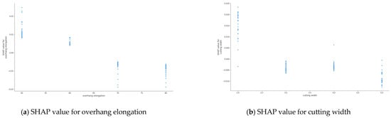 Figure 9b, we observe that when the cutting width is 2.0, there is a positive effect on the target value. However, when the value is 3.0, 4.0, or 5.0, the cutting width usually has a negative effect on the target value. In addition, as the number increases, the effect on the target value remains almost constant. However, whether the internal coupling of the two factors affects the value of the factor requires further analysis of the SHAP dependence diagram of the suspension length and cutting width. The SHAP dependence results of the two factors are shown in