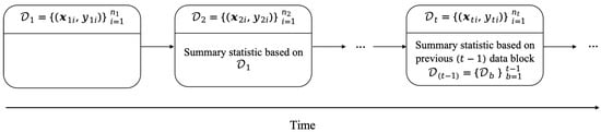 The second challenge arises from the high-speed generation of large-scale datasets, which is also known as streaming datasets [14]. In fact, the statistical analysis of such data presents certain challenges. On the one hand, as streaming datasets are continuously generated, it becomes difficult to store all the data in the memory due to the limited capacity of computer memory. On the other hand, traditional statistical methods are typically based on assumptions derived from complete datasets, which makes them unsuitable for streaming data analysis, where obtaining a complete dataset is challenging. Therefore, in order to enable real-time analysis and updates of streaming datasets, two key issues need to be addressed: (1) the limited memory problem, as historical raw data are discarded when new datasets arrive due to memory storage constraints; (2) the challenge of update speed, as updates must be completed rapidly in streaming data analysis to enable real-time information processing. Online updating methods provide an effective solution to these key issues. These methods do not require access to raw data; instead, they update the model using the current batch of data and the summary statistics of the historical data. As a result, various online updating methods have been developed, including aggregated estimate equation [15], cumulatively updating estimate equation [16], stochastic gradient descent (SGD) and its variants [17,18], as well as renewable estimators [19]. In this paper, we assume that at any specific time point t, only the current data block and the summary statistics based on the previous data blocks are available (see Figure 1). Here, denotes the sample size of streaming data at time point t. And we focus on the “renewable estimation” or “online updating”, which directly update the parameter estimates using summary statistics from both previously processed data and newly arriving batches of data [13].