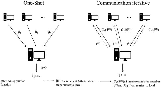 The dc framework is often implemented through two methods, one-shot (os) and communication iterative computation; see Figure 4. Specifically, the os computation refers to a process where tasks are distributed and solved in a single computation, with all nodes working independently before their results are aggregated [22]. This approach is efficient for problems that do not require intermediate communication or feedback between nodes during processing. As an illustration, Lee et al. [68] put forward an efficient and communication-friendly method for distributed high-dimensional sparse regression, grounded in the os approach.