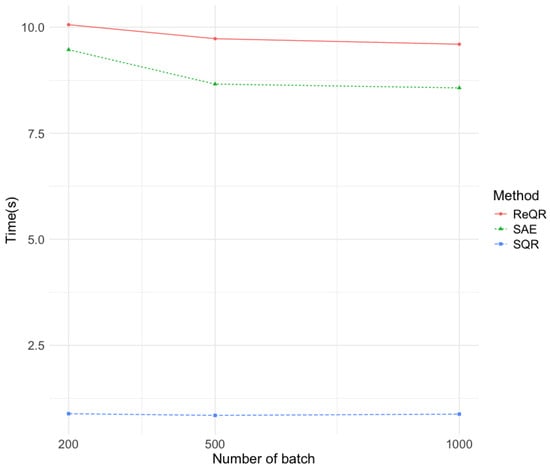 For estimation, given a prior distribution of , the Gibbs sampler can be used to derive the Bayesian QR model. Furthermore, the EM algorithm can be utilized to estimate in (9), as a mixture representation for the ALD was derived using a normal variance-mean mixture with an exponential mixing distribution. More details can be found in [40]. This method employs the ALD as the likelihood function, which is effective in capturing the skewness and heavy-tailed characteristics in the data. However, this method typically requires complex computations, leading to significant computational costs and memory overhead, especially in high-dimensional data. Additionally, the results of this method are highly sensitive to the choice of prior distributions.