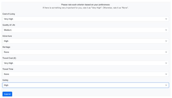 Step 4: Determine the benefit and the cost criteria. A criterion is characterized as benefit when higher values are considered better or more desirable, and a criterion is characterized as cost when lower values are considered better or more desirable. In the presented system, the benefit criteria are adjusted quality of life ranking, adjusted adventure ranking, adjusted heritage ranking, and safety index. The cost criteria are the cost-of-living index, average travel cost, and travel time.