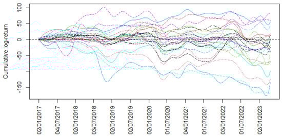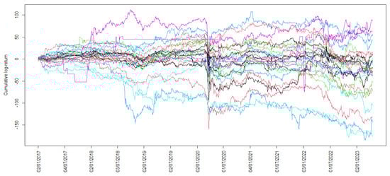 From the data available for the 26 companies listed on the Colombian Stock Exchange from 2 January 2017 to 20 April 2023, the cumulative logarithmic returns were calculated. Figure 2 shows the cumulative logarithmic returns series data about these companies.