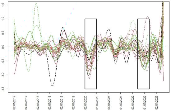 The analyzed crisis periods are framed in this figure. Greater synchronization between the curves can be seen in both periods.