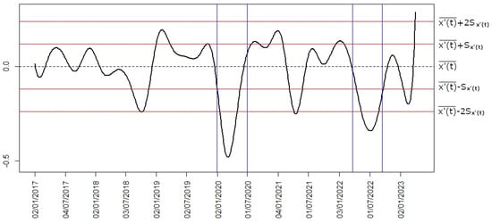 FPCA is a useful tool to identify components that explain the behavior of the set of curves. In this case, the four first principal components account for over 98.9% of the total inertia. As in the vectorial case, the first principal component, which accounts for over 85.8% of the inertia, is a component of size that shows the variation of the prices and, thus, explains the behavior in the long term of BVC. On the other hand, the second principal component, which accounts for over 6.8% of the variability, shows the market’s response to the crises of COVID-19 and the war in Ukraine because this component changes direction and makes the positive and negative disturbances permute. Therefore, the losses become the profits and vice versa. Most likely, approximately 7% of the variability that explains the third and fourth components will be justified by regional or Colombian state causes.