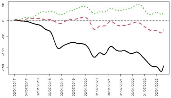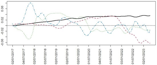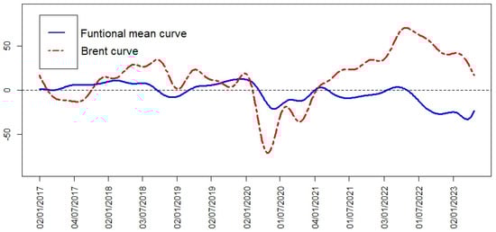 In Figure 6, the functional mean of the BVC’s curves and the cumulative log returns of Brent can be seen. The functional mean shows two declines, one at the beginning of 2020 and the other in 2022. The first decrease was caused by the COVID-19 pandemic, which forced governments to lock down their population and led to a collapse in the oil price. In the period of the second event (which coincides with the Russian invasion of Ukraine), a strong correlation with the oil price is shown (see Figure 6 and Table 2). In this time period, the oil price had a significant decline, which directly affected the Colombian market.