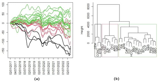 Hierarchical clustering was performed. Three groups with similar trends were observed. (a) The three groups of curves are represented in different colors. (b) The companies that correspond to the previous curves are grouped by using a dendrogram.