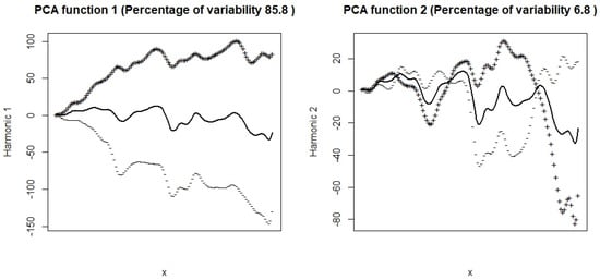 The two principal components are illustrated in Figure 10. These components are the perturbations of their mean function by adding and subtracting a multiple of each principal component. As in the vectorial case, the first principal component, which accounts for over 85.8% of the inertia, is a component of the size that shows the variation of the prices; thus, it explains the behavior in the long term of BVC. On the other hand, the second principal component, which accounts for over 6.8% of the variability, shows the market’s response to the crises of COVID-19 and the war in Ukraine because this component changes direction and makes the positive and negative disturbances permute. Therefore, the losses become the profits and vice versa. Ingrassia and Costanzo [] interpret this component as a “shock” since the shares that had a good (resp. bad) performance before March 2022 have been going down (resp. rising) after that date.