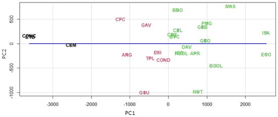 In Figure 11, we consider the projections of the four principal components of the two first ones, and it is possible to see the groups of companies represented in Figure 8. The first group, in the black color, represents the companies with low values in the first component, that is, the companies with long-term losses. The second group, in the red color, with middle values in the first component, are companies with gains close to zero. The third group, in the green color, are companies with high values in the first component, that is, the companies with more long-term gains.