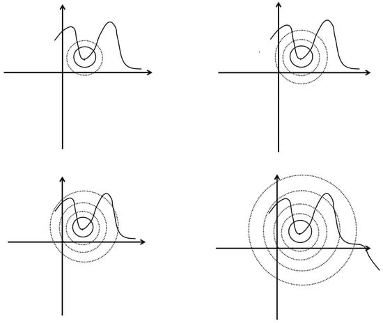 Figure 1 shows how parameter is selected in Algorithm 1, such that Algorithm 1 can obtain the solution to Problem (1). The radius of the dashed circle in the four subgraphs in Figure 1 represents the length of parameter . These four subgraphs show that as the radius increases (parameter increases), the dashed circle can intersect with a function value lower than the center point (current iteration point ). This indicates that with the increase in the value of parameter , Algorithm 1 can further reduce the problem and ultimately obtain the solution to Problem (1).
