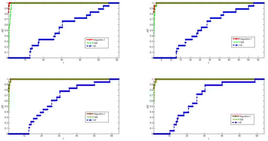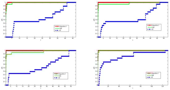 Figure 2 shows the results that used Algorithm 1, SM and IP for calculating Examples 1–5. From the subgraph on the left side of the first row, it can be seen that when we chose the the termination accuracy of the algorithm as , our algorithm had a high computational efficiency in calculating all cases of Examples 1–5. According to (15) and (16), the speed at which the red curve, which represents our algorithm, tends to 1 is relatively fast. At the initial position, the red curve reaches 0.7 (), but the green curve only reaches 0.45 (). Meanwhile, the blue curve reaches almost zero. This means that the algorithm can solve more problems by spending a fewer number of iterations than other methods. Meanwhile, from other subgraphs, with the improvement in the algorithm’s termination accuracy, the initial position values of the red curve are much higher than other two algorithms, and the speed at which it approaches 1 is also the fastest among the three algorithms. From the comparison results of the three methods, it can be seen that our algorithm has a much higher computational efficiency than the other two algorithms, which means that our algorithm is more efficient in solving test problems.