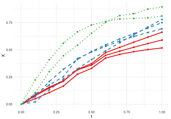 For degradation analysis, there are primarily two kinds of models used to fit the degradation data of the PC. The first type employs regression analysis, wherein the degradation measurements are described by the equation . In this model, the true degradation path depends on unknown parameters and . Several variants of this model have been developed, including those proposed by [12,13,14]. For further details on this type of model, please refer to [15] and the references therein.