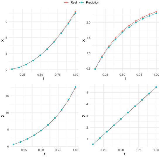 Table 3 presents results for all scenarios based on 100 replications. As can be seen, the conclusions are similar to the ones drawn from the parametric estimators. This suggests that our nonparametric estimators provide small RMSEs, in agreement with the true model. The estimator also presents good finite sample properties, yielding smaller errors when n increases. Moreover, a higher makes it more difficult to estimate , but there are still satisfactory outputs. Additionally, there are different RMSEs under different degradation paths. Perhaps because the linear trend is easier to capture, RMSEs based on and are smaller. Let us take and as an example; the predicted mean degradation paths with based on our model under four kinds of are shown in Figure 2. As can be seen, the predictions are close to the true values, indicating that our estimator is accurate. All simulation results suggest the scalability and robustness of the proposed model, handling both linear and nonlinear paths with heterogeneous covariates well, which is helpful when there is no prior information about the degradation.