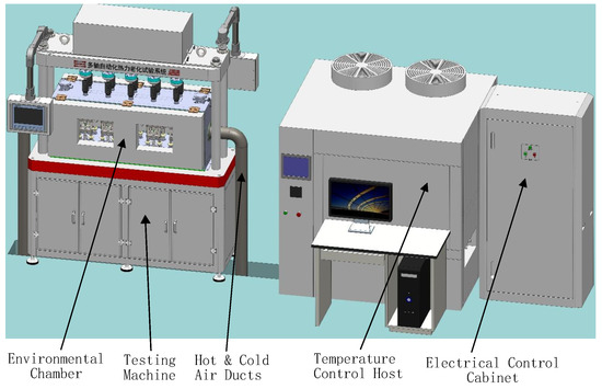 Degradation data can be obtained with a type of multi-axis automated thermal aging test system which functions as an aging box that monitors the corresponding creep. A schematic diagram of the experimental setup allowing for the real-time and efficient tracking of the lubrication layer’s creep behavior is shown in Figure 3. The material was put in the testing machine, with the environment chamber simulating the real working surroundings. The temperature control host and electrical control cabinet were used to modify the features of interest to mimic various real environments. To capture the nuanced creep patterns exhibited by the lubrication layer, specialized sensors were employed to continuously monitor and transmit data throughout the experimentation.