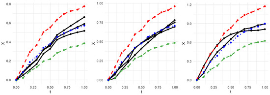 Estimation results obtained with our model for wax data at 17 °C (left), 19 °C (middle), and 21 °C (right). Black solid line: true data; blue dotted line: estimated path; green dashed line: 2.5% lower bound; red dashed line: 97.5% upper bound.