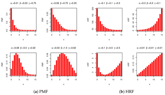 Figure 1 illustrates various shapes of the PMF and HRF for the DH distribution, generated using different parameter selections. The PMF of the DH model is shown to exhibit right-skewed or symmetric patterns, while the HRF displays diverse forms, including decreasing, increasing, and bathtub-shaped patterns. Additionally, the shapes presented in the figure highlight that the DH model can naturally represent forward or backward recurrence time patterns within renewal processes.
