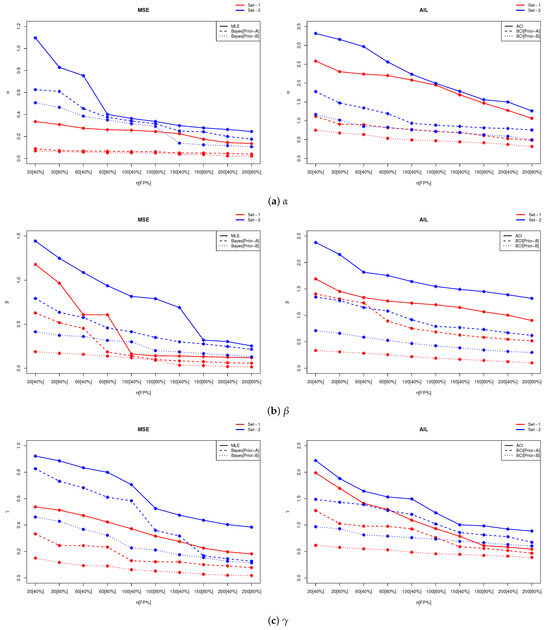 The overall estimation accuracy varies depending on the data structure. The results from Set-1 yield more precise estimates of , , and compared to Set-2. Moreover, as the values of these parameters increase, a deterioration in estimation precision is observed, characterized by higher MSE, MAB, and AIL values and a corresponding decline in CP values.