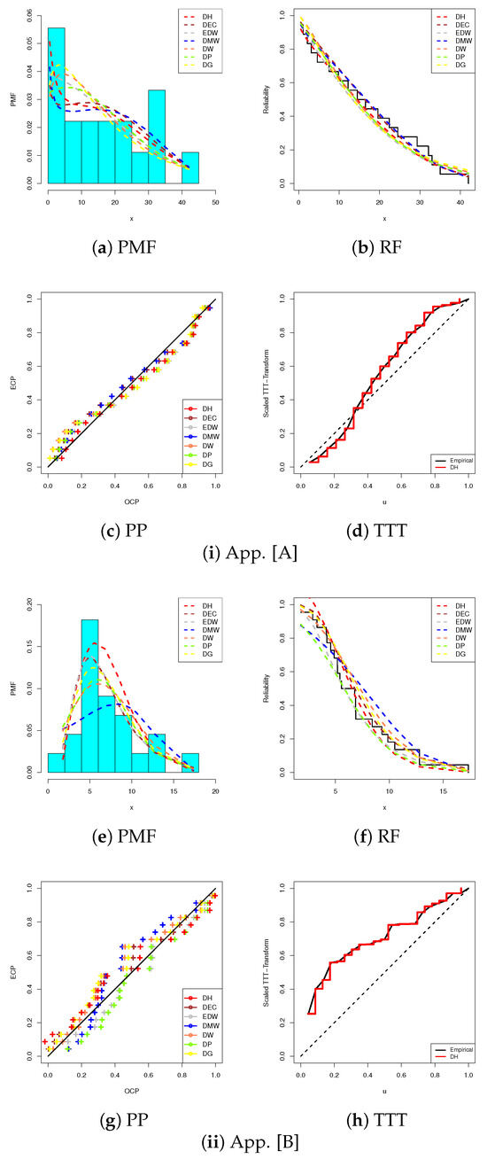 p-values greater than 5%. It exhibits that the newly proposed DH distribution provides the best fit for both applications in terms of estimated PMF, RF, and PP curves.