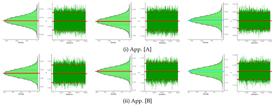Additionally, to explore the convergence and blending of Markovian chains, the acceptance rates of the M–H proposals are calculated, such as