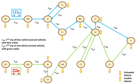 In Figure 2, it should be noted that the blue box denotes the second type of trailer, whereas the blue vehicle indicates the number of owned vehicles at the relevant departure point. Additionally, the blue trailer is restricted and cannot carry the second type of product. When considering a subproblem and its network where a blue vehicle with blue type of trailer is about to depart from the relevant departure point, the inward arcs for the second-product-type-based supply node and second-product-type-based washing nodes have been removed (as can be seen in Figure 2, second-product-type-based customer nodes can only be visited after visiting the second-product-type-based supply node; therefore, these customers cannot be visited after the removal of the inward arcs of the second-product-type-based supply node). Thus, the relevant trailer is forced to visit relevant supply nodes on the subproblem network without violating the trailer–product matrix.