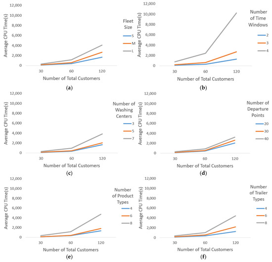 Recalling that our problem involves high-dimensional structures and each input has its own breakdowns, one can examine the CPU(s) in a multi-dimensional frame. Thus, Figure 4 enables one to investigate the two-dimensional variation of CPU(s) among instances. In Figure 4, one of those dimensions is always labeled the number of customer points, as the VRP literature is familiar with. However, in order to complete the two-dimensional frame, the other dimension is selected among fleet size, the number of time windows, departure points, the number of product types, trailer types, and washing centers. The VRP literature widely acknowledges that an increase in the number of customer nodes significantly escalates the solution time in VRP. However, as illustrated in Figure 4, other factors, such as fleet size, the number of time windows, the number of washing centers, the number of departure nodes, and the number of product and trailer types, can further exacerbate the challenges posed by a large number of customers. In short, we aim to examine how the CPU time reacts when extra complexities are added to our specified FTL network. For example, instances that have a high number of time windows and a high number of customer points increases the CPU time more exponentially than ones which have a high number of washing centers and high number of customer points. In particular, Figure 4b demonstrates that the increase in the number of time windows intensifies the solution time more substantially compared to Figure 4a–f, while the number of customers grows. This effect is evident because the divergence between lines in Figure 4b becomes more pronounced as the customer size increases. In contrast, Figure 4d reveals that an increase in the number of departure points results in an almost linear shift in solution time as opposed to others, whereas the number of customers rises due to the fact that the divergence between lines is not growing considerably. Additionally, with respect to Figure 4e,f, it can be inferred that CPU time is more sensitive in Figure 4f. This is because the divergence between lines is more apparent in Figure 4f. This situation implies that while instances with a high number of customers are observed, the CPU time tends to react more significantly with the rising number of trailer types than with the growing number of product types. Regarding Figure 4a,c, it can be deduced that the reaction of the CPU time tends to be more elevated in Figure 4a due to the divergence between lines being more obvious. This circumstance indicates that while instances with a high number of customers are observed, the CPU time tends to respond more visibly to the increase in fleet size than to the increase in washing centers.