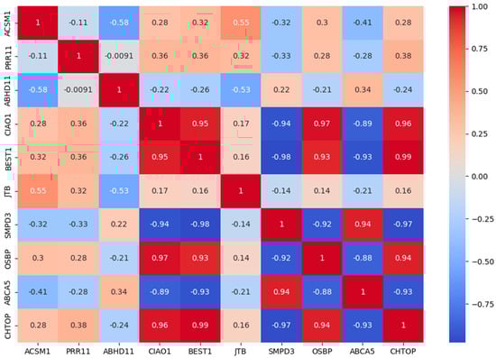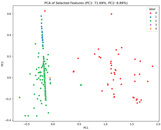 This research makes use of gene expression data from six ovarian cancer microarray datasets, which are publicly available on the Kaggle platform. These datasets include GSE6008, GSE9891, GSE18520, GSE38666, GSE66957, and GSE69428 [22,23]. The dataset comprises 502 ovarian cancer samples representing five different ovarian cancer types, providing a rich basis for this study. By performing feature selection and analysis on these datasets, the research aims to explore key genes and features associated with ovarian cancer, ultimately revealing potential biomarkers for the disease. These genes and features not only help identify early signs of cancer but also offer more targeted support for personalized treatment. Figure 1 depicts the class distribution of the original dataset, highlighting the significant imbalance between classes within the ovarian cancer data. Specifically, the number of samples in class 2 far exceeds that of other types, which may affect the model’s training performance and prediction accuracy. Figure 2 reveals the correlations between different features through Pearson correlation analysis and identifies which features are more strongly correlated with the target variable (ovarian cancer type). The top ten features in Figure 2 were selected using the XGBoost algorithm. Through Figure 2, we can detect multicollinearity among these features, thereby providing intuitive guidance for subsequent model construction. This is because high correlations between certain features may lead to model overfitting or reduce model interpretability in machine learning. By analyzing these correlations, the most representative and independent features can be selected. Figure 3, through dimensionality reduction visualization, illustrates the separation between different ovarian cancer types, demonstrating the biological differences among cancer subtypes. The distinct separation between categories in the feature space establishes a solid foundation for future classification models. To further enhance model performance, the XGBoost algorithm was employed to rank feature importance and select the top 10 most predictive features [24,25]. These features have potential clinical significance for ovarian cancer diagnosis and treatment. Table 1 lists these key features and briefly introduces their biological functions in the human body. Through in-depth analysis of the ovarian cancer gene datasets, it is possible to provide more accurate and effective tools for early diagnosis, treatment decision-making, and prognosis evaluation of ovarian cancer.