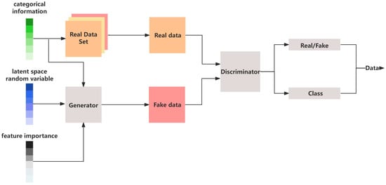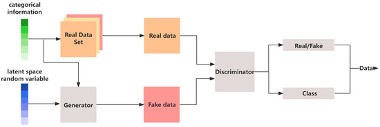 The original Generative Adversarial Network (GAN) had relatively basic functionality, only being able to generate simple samples based on the given data. However, over time, researchers have made several improvements to GAN, expanding its applications in different fields. In the area of image processing, Koo et al. adopted the Deep Convolutional GAN (DCGAN), enabling the automatic colorization of black-and-white images [30]. At the same time, the Conditional GAN (cGAN) was introduced, which integrates conditional information to ensure that the generated samples align with the training data distribution while also meeting specific conditions [31]. In 2016, Odena et al. introduced the Auxiliary Classifier GAN (ACGAN), a novel extension of the cGAN architecture that incorporates an auxiliary classifier. By integrating this classifier, the ACGAN enabled both the generator and discriminator to make use of classification information, leading to an enhancement in the diversity and quality of the generated samples [32]. The architecture of the ACGAN is illustrated in Figure 4. In addition to the traditional binary cross-entropy loss used for discriminating between real and fake samples, a supplementary classification loss function was incorporated to optimize classification tasks. This adjustment empowered the discriminator to acquire more comprehensive feature representations, thereby enhancing its learning capabilities.