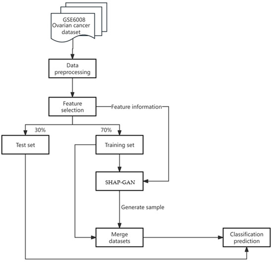 The dataset used in this study for ovarian cancer encompasses five different types of ovarian cancer, along with information on more than 10,000 related genes. To improve data accuracy and eliminate batch effects, the PyComBat 0.4.4. tool is applied to process these datasets and normalize features in the data preprocessing. Although the dataset provides rich information for cancer research, handling such a large dataset presents a significant challenge for physicians in practical applications. Relying on these gene data for preventive diagnosis would burden doctors, making it difficult to quickly and accurately extract key information for diagnosis. To overcome this challenge, XGBoost 2.1.4. was used to select features. Additionally, there is a severe data imbalance issue in the dataset, with certain types of ovarian cancer having far fewer samples than others. Data imbalance can lead to poor learning performance for the minority classes, affecting the accuracy of recognizing these rare types. Given the complexity and lethality of ovarian cancer, it is crucial to ensure that the model can effectively distinguish all types of cancer to avoid misdiagnosis or missed diagnosis. The proposed algorithm includes the SHAP-GAN data augmentation technique followed by using the XGBoost model for classification. It should be noted that the SHAP-GAN was only applied to the training set to augment data.