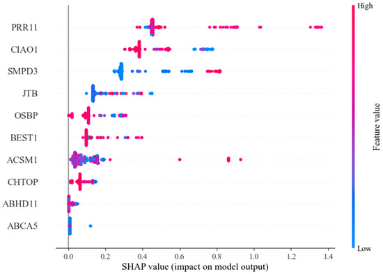 Figure 9 showcases the SHAP values associated with each feature, where the horizontal axis denotes the SHAP value. This axis elucidates the extent to which each feature influences the ultimate prediction, providing crucial insights into the significance and function of each feature within the model’s decision-making framework. The vertical axis lists the feature names. The color gradient from blue to red indicates the change in feature value from low to high, and the distribution of points reveals the relationship between feature values and SHAP values. This helps to understand whether each feature has a positive or negative impact on the model’s prediction and sheds light on the decision-making process of the model. From the figure, it is evident that after feature selection, all features exert a positive influence on the model. The top three features with the greatest influence are PRR11, CIAO1, and SMPD3. The SHAP value distribution of these three factors is quite broad, indicating their significant impact on the model’s output. PRR11, a proline-rich protein, plays a crucial role in regulating the cell cycle, with its dysregulated expression potentially fueling the growth and survival of cancerous cells. On the other hand, CIAO1 is intricately linked to endocytosis and the transport of proteins within the cell, exerting a significant influence on the integrity and functionality of the cell membrane. In cancer cells, CIAO1 may promote tumor cell proliferation and metastasis, and its abnormal expression may alter the intracellular protein localization, thereby impacting cell proliferation, migration, and anti-apoptotic functions. SMPD3 is responsible for encoding a sphingomyelin phosphodiesterase, crucial for the degradation of sphingolipids that play a vital role in preserving the integrity and signaling of cell membranes. Any irregularities in these genes may disrupt essential cellular functions like growth, metabolism, and migration, all of which are significant contributors to cancer progression.