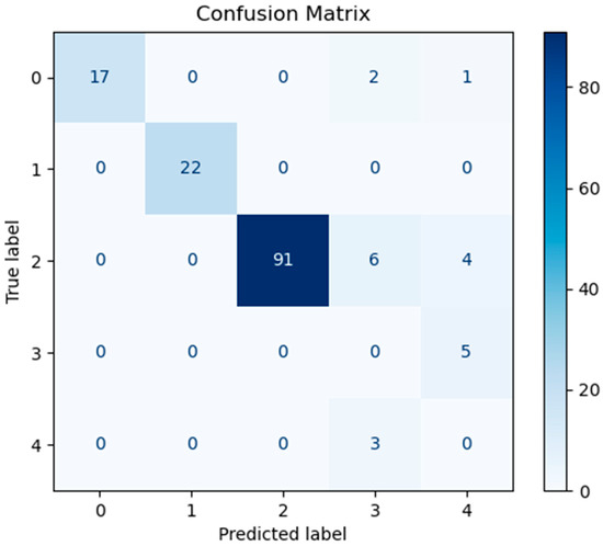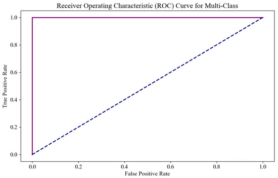 Figure 14 shows the ROC curve of the model on this dataset, where the x-axis represents the false positive rate and the y-axis represents the true positive rate. As the decision threshold changes, the values of TPR and FPR also change, forming a curve that reflects the model’s classification performance at different thresholds. In the ROC curve, the area under the curve (AUC) indicates the model’s classification ability, with the AUC value ranging from 0 to 1. The closer the AUC is to 1, the stronger the model’s classification ability. An AUC of 0.5 indicates that the model has no classification ability. According to the ROC curve, the AUC for classes 0, 2, 3, and 4 is 1, indicating perfect classification performance. While the AUC for class 3 is also 1, as shown in Figure 11, its curve slightly deviates from ideal classification. This is because the AUC is calculated by evaluating the model’s classification rate across all classes, and the limited sample size for class 1 means the model may over-rely on a small number of samples. As a result, even if the model only predicts a few class 3 samples, it may still achieve a high AUC. This issue is commonly known as the “class imbalance” problem, where a high AUC for minority classes may not truly represent the model’s classification performance for those classes. Therefore, while the AUC is 1, it does not imply that the model’s prediction capability for class 3 is entirely reliable, and there may be a deviation in the actual performance. Overall, the results in Figure 11 provide strong evidence of the excellent predictive performance of the algorithm proposed in this study for ovarian cancer classification tasks, demonstrating its robust identification ability across multiple classes.