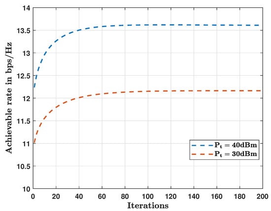 Figure 2 depicts the convergence behavior of the proposed SPSA-based optimization algorithm under two different transmit power levels of the H-AP. The results demonstrate that the algorithm converges efficiently within approximately 50 iterations for both transmit power levels, reflecting the effectiveness of the SPSA method in addressing non-convex optimization problems. For dBm, the objective function stabilizes at approximately 13.5 bps/Hz, while for dBm, it converges to around 12 bps/Hz. This illustrates the significant impact of increased transmit power on achievable throughput, with higher power enabling better network performance. The proposed algorithm’s rapid convergence and stable results confirm its robustness in optimizing resource allocation in RSMA-aided wireless powered communication networks.