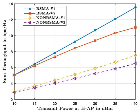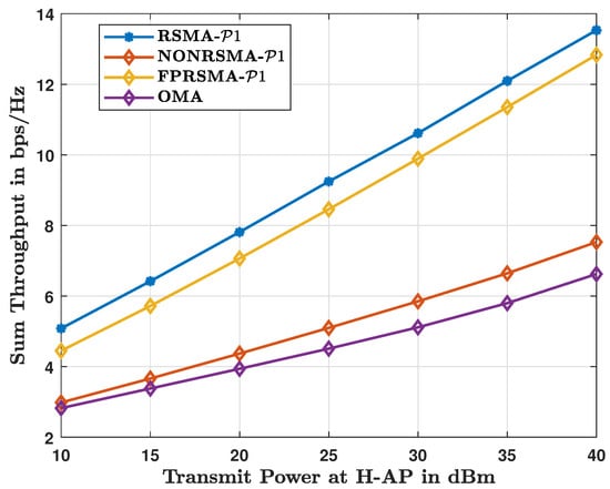 Figure 3 shows the solution to and demonstrates the relationship between the sum throughput (in bps/Hz) and the transmit power of the H-AP (in dBm) for four different schemes, RSMA-, FPRSMA-, NONRSMA-, and OMA. The results highlight the superior performance of RSMA-, which involves optimizing both power allocation coefficients and time allocation using the SPSA algorithm. FPRSMA-, using fixed power allocation and time optimization, achieves slightly lower throughput. NONRSMA-, a TDMA-based scheme with optimized time allocation, performs moderately but remains significantly below RSMA-based schemes. OMA, with fixed power and time allocations, consistently achieves the lowest throughput. The figure demonstrates that as the H-AP transmit power increases, all schemes experience improved throughput. However, RSMA- outperforms the others significantly, showcasing the effectiveness of RSMA-based optimization in improving system performance under varying power levels.