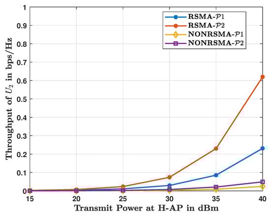 Figure 4 illustrates the throughput of (in bps/Hz) as a function of the transmit power of the H-AP (in dBm) for and . RSMA- optimizes the sum throughput of the system, achieving a steady increase in ’s throughput as the transmit power grows. RSMA-, which optimizes the minimum throughput to enhance fairness between users, significantly improves ’s throughput, particularly at higher power levels, surpassing RSMA-. This demonstrates the effectiveness of RSMA- in ensuring balanced resource allocation between users. In comparison, NONRSMA-, a TDMA-based scheme focused on sum throughput optimization, shows limited improvement in ’s throughput, reflecting the inefficiency of non-RSMA schemes in managing interference and allocating resources effectively. NONRSMA-, which optimizes the minimum throughput for fairness in TDMA, provides better throughput for than NONRSMA- but remains significantly below the RSMA-based schemes, particularly at higher transmit power levels. The figure highlights the superiority of RSMA-based schemes over NONRSMA schemes in improving ’s performance. RSMA-, in particular, demonstrates remarkable fairness by ensuring higher throughput for , even as the system prioritizes minimum throughput optimization.