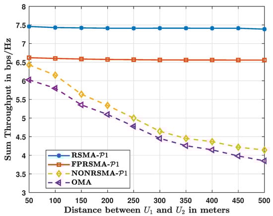 Figure 5 illustrates the sum throughput (in bps/Hz) as a function of the distance between and (in meters). RSMA- achieves the highest and most consistent throughput, demonstrating its efficiency in handling interference and resource allocation regardless of user distance. FPRSMA also maintains a nearly constant throughput but performs slightly worse due to fixed power allocation. NONRSMA- shows a decreasing trend as distance increases, reflecting its limited ability to manage interference and adapt resource allocation. OMA performs the worst, with significant throughput degradation, as orthogonal resource allocation and fixed scheduling fail to handle the challenges of increasing user separation. The figure highlights the robust performance of RSMA- compared to other schemes.