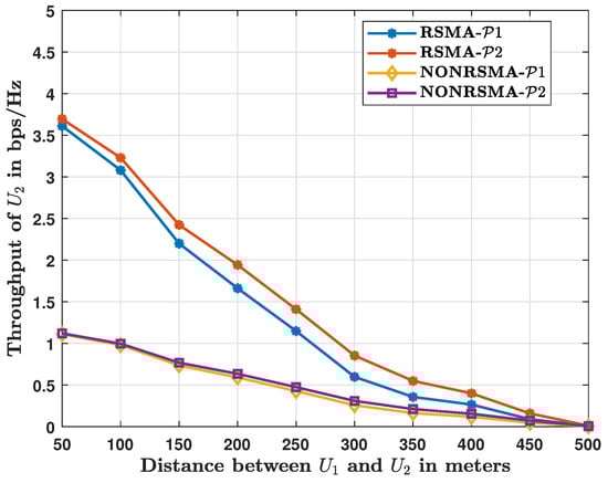 Figure 6 illustrates the throughput of (in bps/Hz) as a function of the distance between and (in meters) for four schemes: RSMA-, RSMA-, NONRSMA-, and NONRSMA-. As the distance between users increases, the throughput of decreases across all schemes due to increased path loss and weakened interference management. RSMA- achieves the highest throughput for at shorter distances, while RSMA- performs better at larger distances, prioritizing fairness and balancing resource allocation. NONRSMA- and NONRSMA- exhibit significant degradation in throughput with increasing distance, reflecting the limitations of TDMA-based approaches in handling interference and optimizing resource allocation. These results emphasize the superiority of RSMA in maintaining higher throughput and fairness under varying user separations.