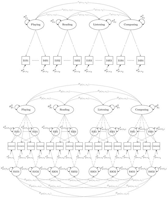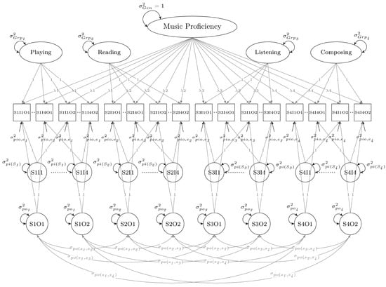 We will apply SEM procedures for analyzing persons × items (pi) single-facet and persons × items × occasions (pio) two-facet GT designs based on responses to a self-report measure (i.e., the shortened form of the Music Self-Perception Inventory (MUSPI-S) [116,117,118,119]) that can be interpreted from univariate, multivariate, and bifactor model perspectives. Each facet of measurement (items and occasions here) within the targeted design represents a domain to which results are generalized. The general partitioning of observed score variance at the individual score level for these designs is described in Equations (1) and (2).