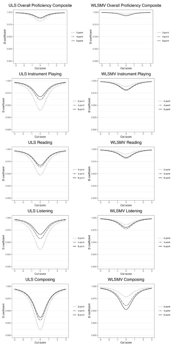 Cut-score-specific D coefficients. For purposes of comparison, cut-score-specific D coefficients for composite and subscale scores using both ULS and WLSMV estimation are depicted on Z-score metrics (M = 0, SD = 1) in Figure 5. Across scales and estimation procedures, dependability is lowest at the scale mean and progressively increases as scores deviate farther and farther away from the mean. Consistent with the results for G and global D coefficients, composite cut-score-specific D coefficients based on ULS estimates always exceed those for subscales at common standard deviation distances away from the scale mean. As expected, differences in G coefficients, global D coefficients (Table 6), and cut-score-specific D coefficients (Figure 5) for observed scores based on ULS estimation are typically greater between two and four scale points than between four and eight scale points. However, this pattern does not hold for the continuous latent variable response metric based on WLSMV estimation in which corrections for coarseness are greater for 2-point than for 4- or 8-point scales. As scores become increasingly extreme for all scales and estimation procedures, cut-score-specific coefficients across numbers of item scale points begin to coincide, thereby illustrating that the number of scale point effects on score dependability are noticeably greater within the middle of score distributions than at the extremes.